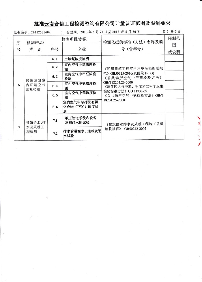 云南合信工程檢測(cè)咨詢有限公司建筑給水排水、采暖工程相關(guān)檢測(cè)能力: