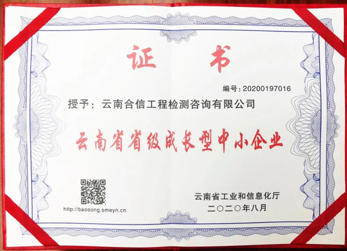 近日,經(jīng)過云南省工業(yè)和信息化主管部門組織推薦、公開申報(bào)、專家評審、網(wǎng)上公示等程序,云南合信工程檢測咨詢有限公司獲評”2020年度云南省省級成長型中小企業(yè)”。