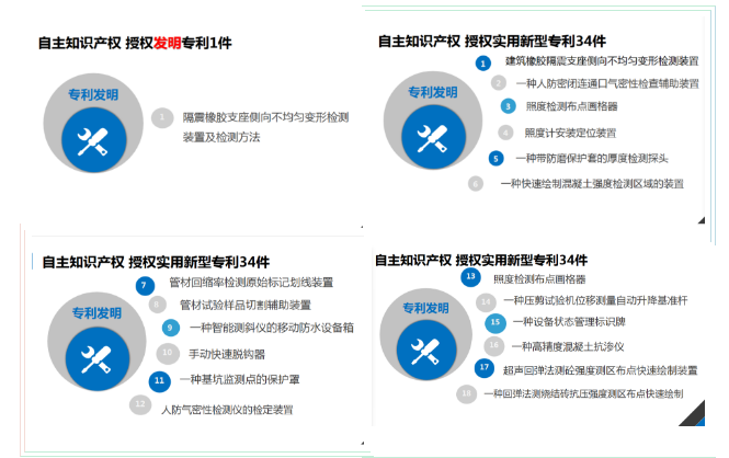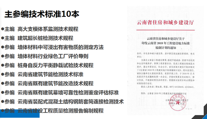 獲評”云南省知識產(chǎn)權(quán)優(yōu)勢企業(yè)”榮譽稱號,是上級對云南合信公司科技成果的肯定,也是公司重視科技創(chuàng)新的重要體現(xiàn)。云南合信公司始終把創(chuàng)新作為引領(lǐng)企業(yè)發(fā)展的第一動力,一直非常重視知識產(chǎn)權(quán)對企業(yè)效益的提升作用,高位推進技術(shù)創(chuàng)新工作。截止目前,公司申報自主知識產(chǎn)權(quán)專利44件(含發(fā)明專利3項),已授權(quán)35件(含發(fā)明專利1項)。新立科研項目6個,在研項目12個,已出成果10項。公司主參編技術(shù)標準10本,其中主編地標2本,參編國標1本、行標1本、地標6本。2020年,公司新申報主編地方標準《高大支模體系監(jiān)測技術(shù)規(guī)程》和《建筑超長樁檢測技術(shù)規(guī)程》已通過立項審查,并已啟動編制工作;參編《墻體材料中可浸出有害物質(zhì)的測定方法》、《墻體材料行業(yè)綠色工廠評價導(dǎo)則》已完成報批;參編地方標準《云南省建筑抗震支吊架檢測及施工驗收技術(shù)規(guī)程》已完成所負責章節(jié)的編寫工作。
