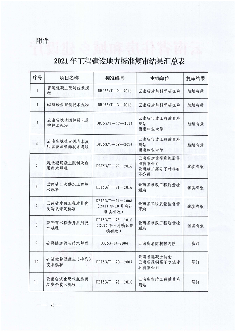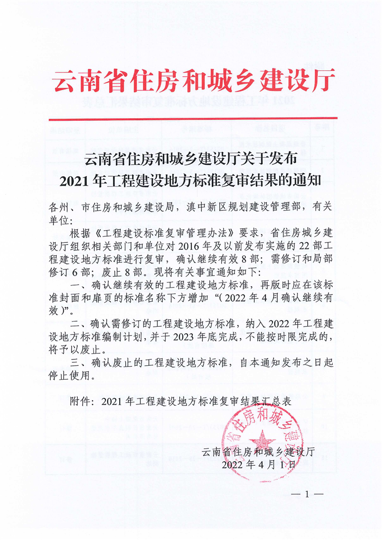 云南省住房和城鄉(xiāng)建設廳關(guān)于發(fā)布2021年工程建設地方標準復審結(jié)果的通知
