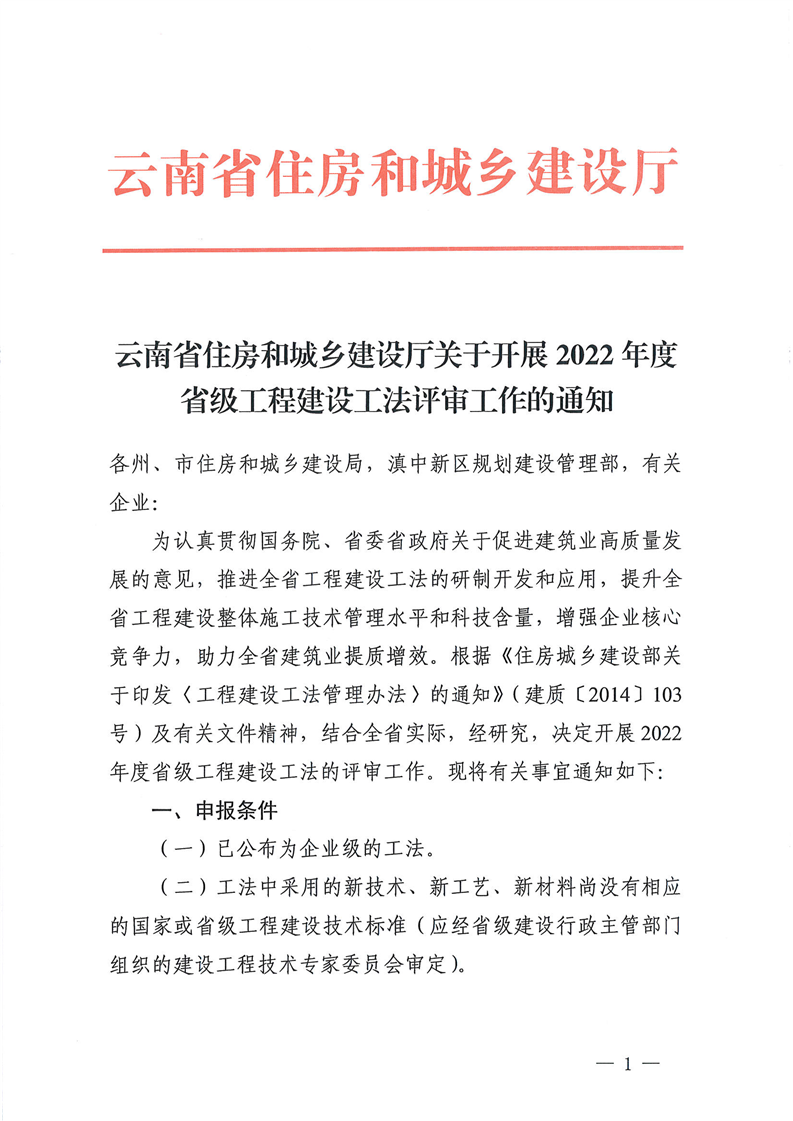 云南省住房和城鄉(xiāng)建設(shè)廳關(guān)于開展2022年度省級工程建設(shè)工法評審工作的通知