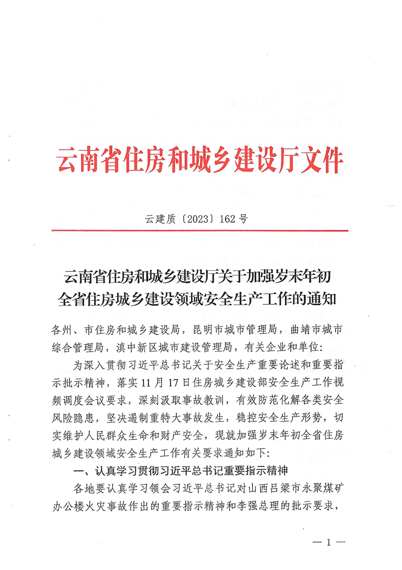 云南省住房和城鄉(xiāng)建設廳關于加強歲末年初全省住房城鄉(xiāng)建設領域安全生產工作的通知